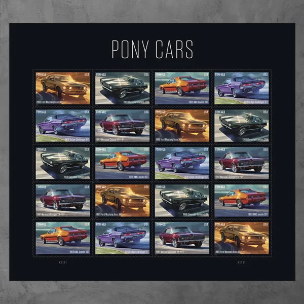 Pony Cars set includes five stamp designs, paying tribute to influential and iconic models.