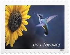Each stamp features a close-up photograph of a single, female ruby-throated hummingbird hovering next to a colorful bloom, a zinnia, cigar flower, spotted touch-me-not, or sunflower.