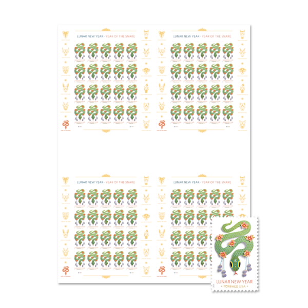 Ring in the new year with the 6th issuance in this popular series — the Lunar New Year: Year of the Snake stamp from the U.S. Postal Service®. The stamp image features a green 3-dimensional mask of a snake, a contemporary take on the long tradition of paper-cut folk-art crafts created during this time of year. Use these stamps all year long!