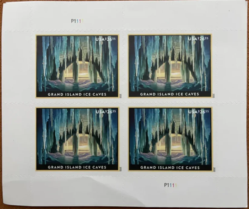 On January 18, 2020, in Munising, MI, the United States Postal Service® will issue the $26.35 Grand Island Ice Caves Priority Mail Express® stamp in one design, in a pressure-sensitive adhesive (PSA) pane of four stamps (Item 129100). The stamp will go on sale nationwide January 18, 2020, and must not be sold or canceled before the first-day-of-issue.